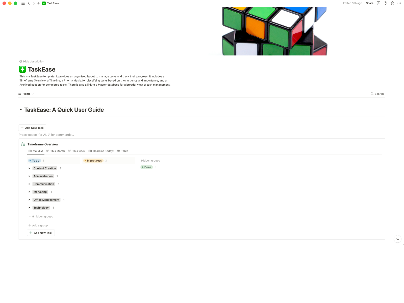 TaskEase: A user-friendly Notion template for efficient task management. Features easy tracking, prioritization, and archiving. Ideal for streamlining both personal and professional tasks.